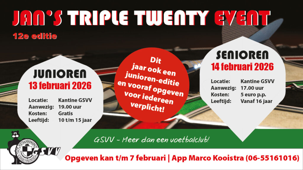 Leden van GSVV, jong en oud, haal de pijlen maar uit de kast! Op vrijdag 13 en zaterdag 14 februari 2026 verandert onze kantine op sportpark ‘t Kleaster weer in een ware dartarena voor de 12e editie van het Jan’s Triple Twenty Event.